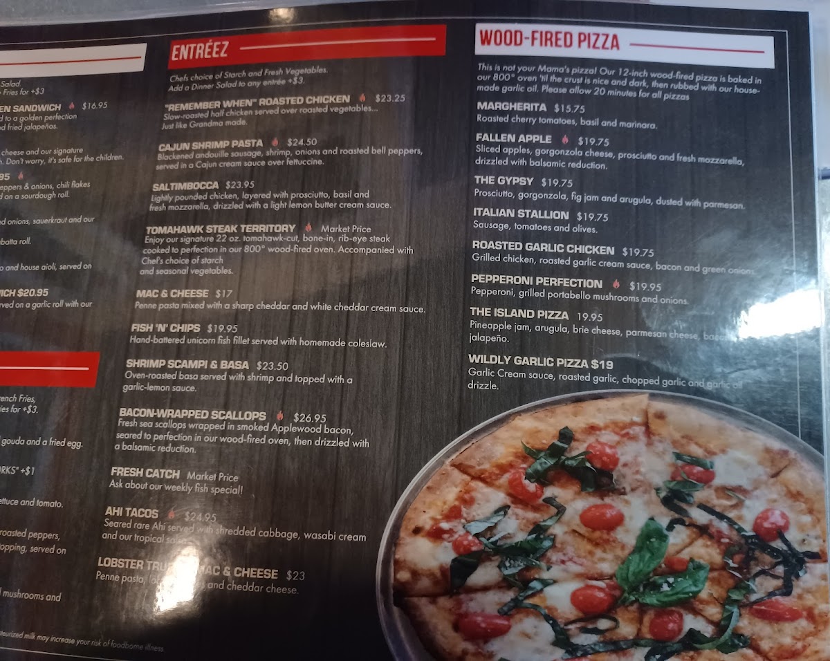 Febery specialty enjoy our signature 22 oz. tomahawk-cut, bone-in, rib-eye steak cooked to perfection in our 800° wood-fired oven. Served on a sizzling cast-iron skillet, accompanied with chef's choice of starch and seasonal vegetables
